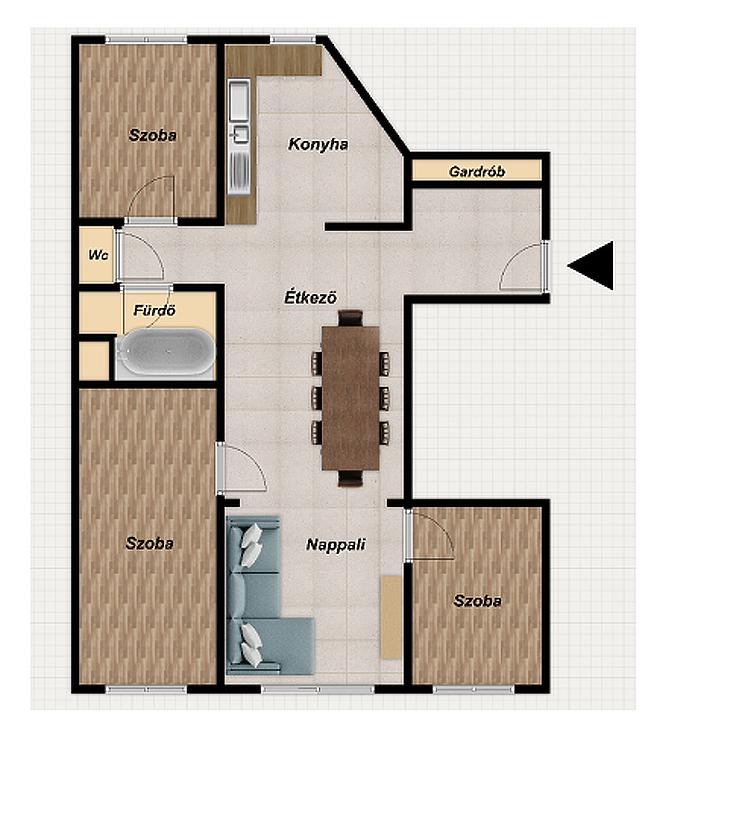 • laminált parketta a szobákban, járólap a többi helyiségben