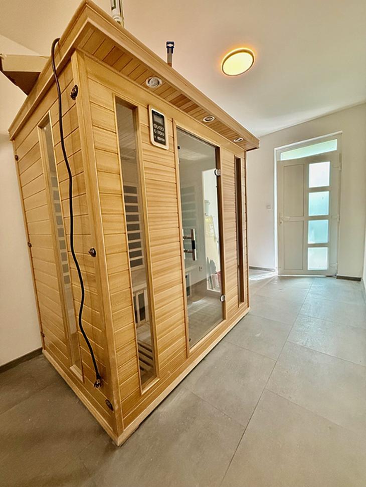 Tartozik a házhoz fedett kocsibeálló, Jacuzzi és kombinált finn szauna, valamint a napelemes rendszer és elektromos autó töltő rendszer előkészítése is megtörtént.