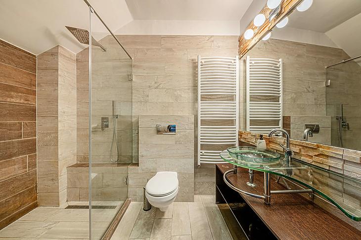 Az alsó szinten található egy különálló mosdó, még a felső emeleten egy beépített zuhanyzós ideális méretű fürdőszoba.