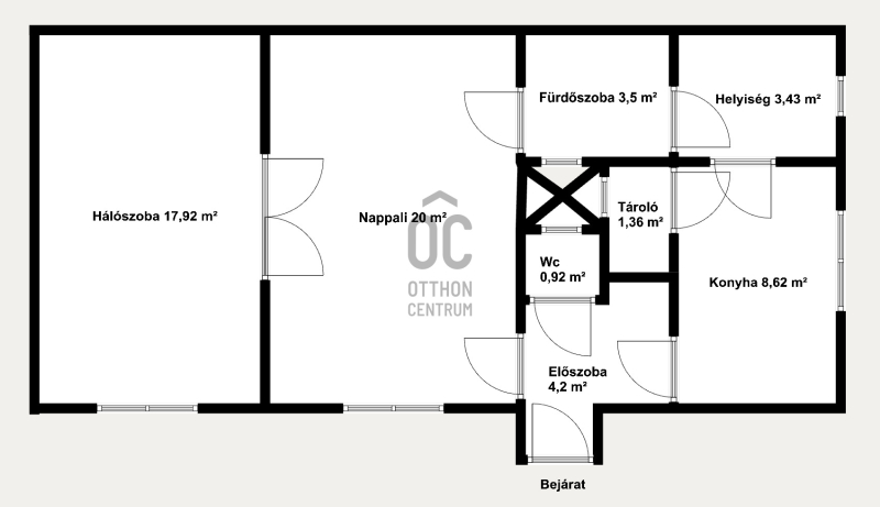 A jelenlegi kialakítás szerint egy 20 m²-es nappali, egy 18 m²-es hálószoba, egy kisebb szoba (ami tárolónak vagy gardróbnak ideális), egy 8,6 m²-es konyha, valamint egy fürdőszoba és külön mellékhelyiség áll rendelkezésre. Az előszoba és a közlekedő jól szervezi a lakás tereit, továbbá egy 1,4 m²-es tároló is helyet kapott, ami a mindennapokban kifejezetten praktikus.
