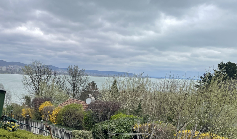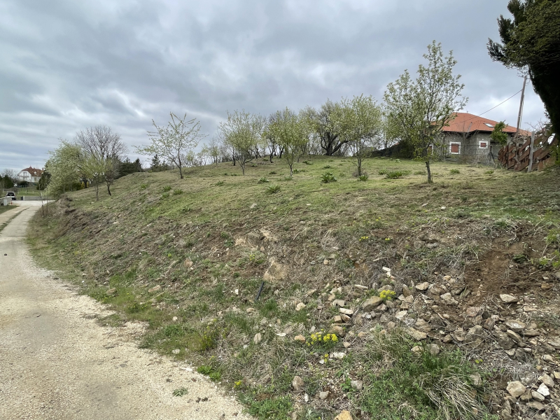 A telek enyhén emelkedő kialakítása finoman vezeti a tekintetet a táj felé: a felső pontokról a Balaton részpanorámája bontakozik ki észak-kelet felé, míg más irányban a Külső-tó nyugalma és a környező dombok látványa határozza meg a térélményt.