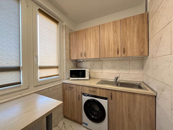 Az ingatlan új gépekkel felszerelt: mosógéppel, hűtőszekrénnyel, mikróval. A lakás bútorozott, a beépített szekrényeknek köszönhetően rengeteg pakoló felület van. A két szoba klimatizált.