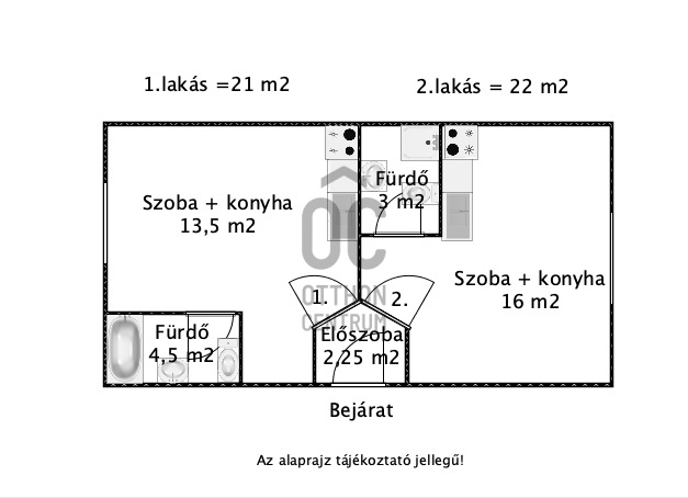 A 21 nm-es lakás elrendezése praktikus nappali-étkező-konyha egy légtérben, valamint egy különálló fürdőszoba wc-vel. A fűtés elektromos. Hálózati melegvizet villanybojler állítja elő.