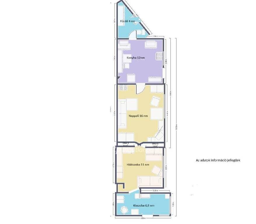 A lakás 2 és fél szobás elrendezésű, praktikus kialakításának köszönhetően kényelmes életteret biztosít akár családok számára is. Déli fekvésének köszönhetően világos, napfényes helyiségek jellemzik egész nap.