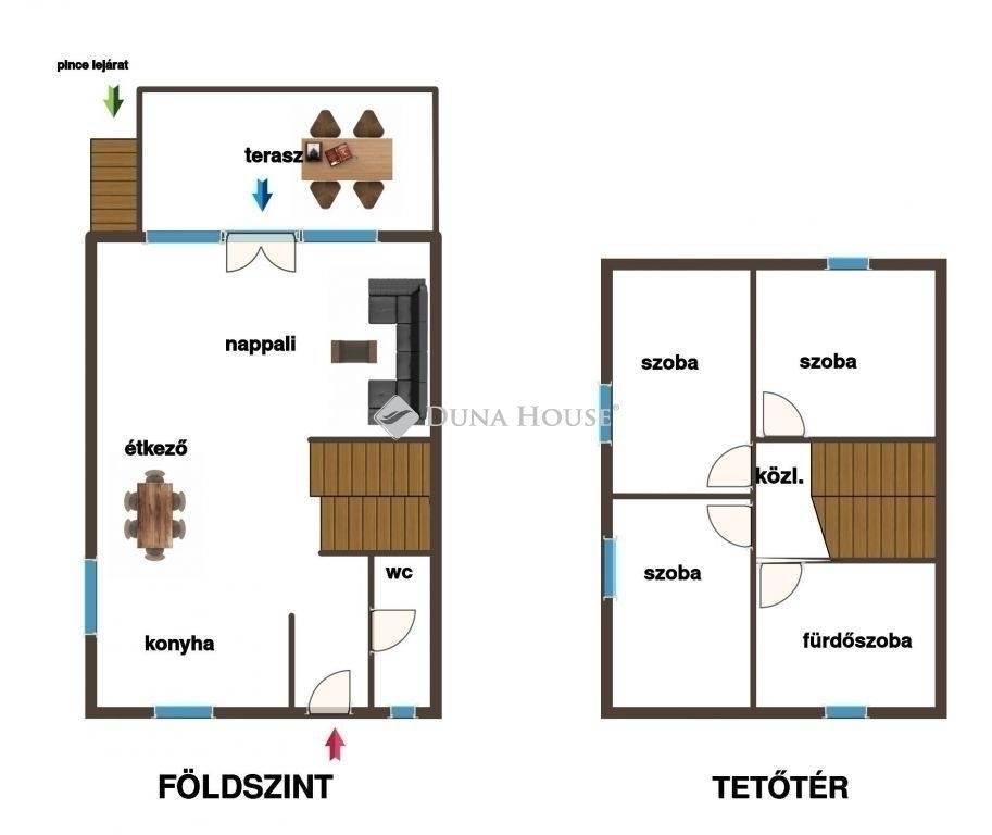 A tetőtérben 3 hálószoba és egy kádas fürdőszoba került kialakításra