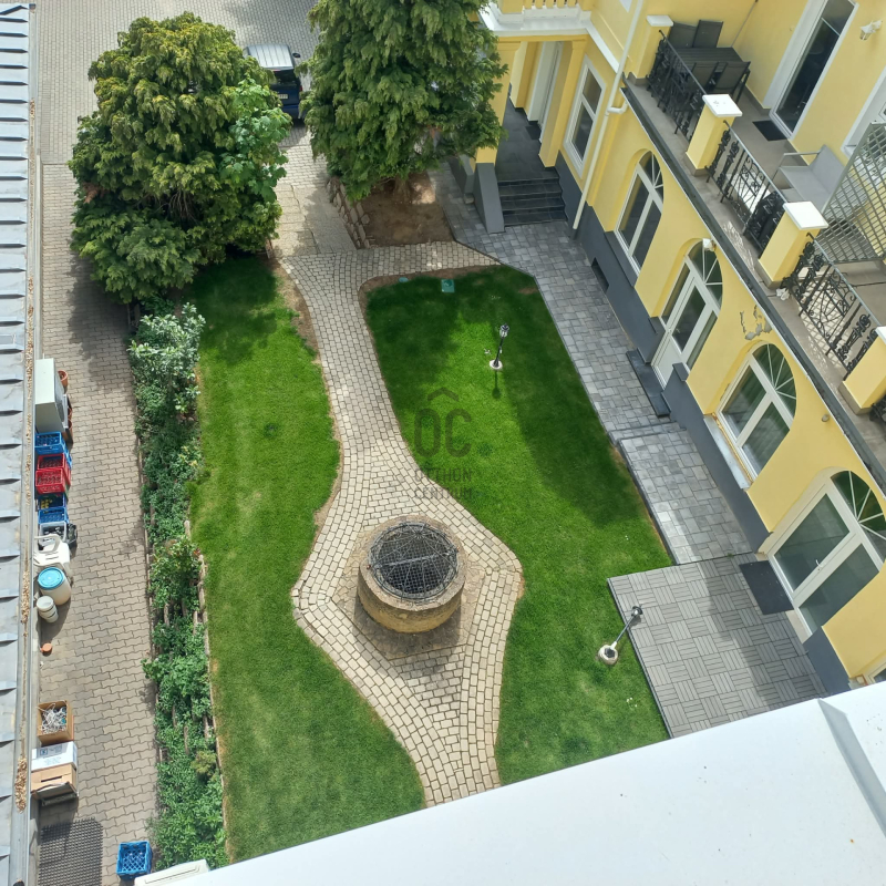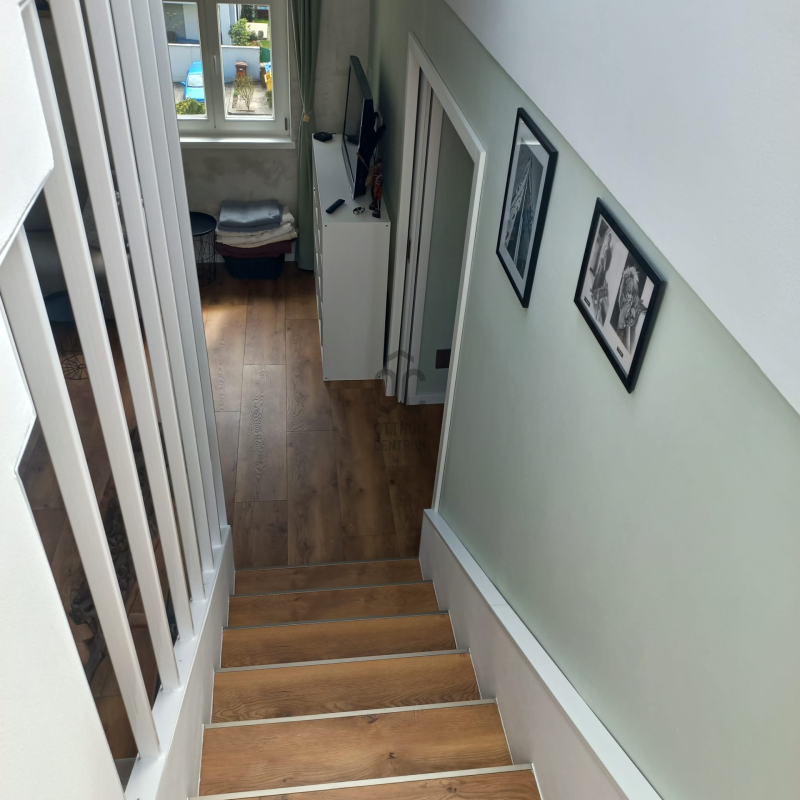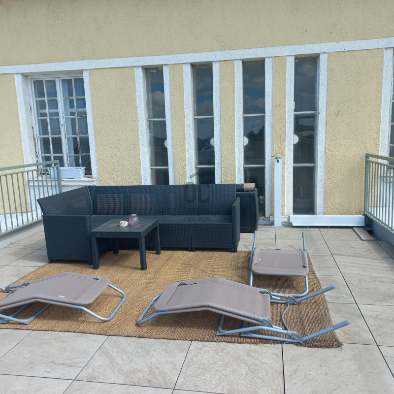A tetőterasz közvetlenül a lakásból, egy elegáns belső lépcsőn közelíthető meg, így tökéletes helyszín pihenéshez vagy akár vendégfogadáshoz.