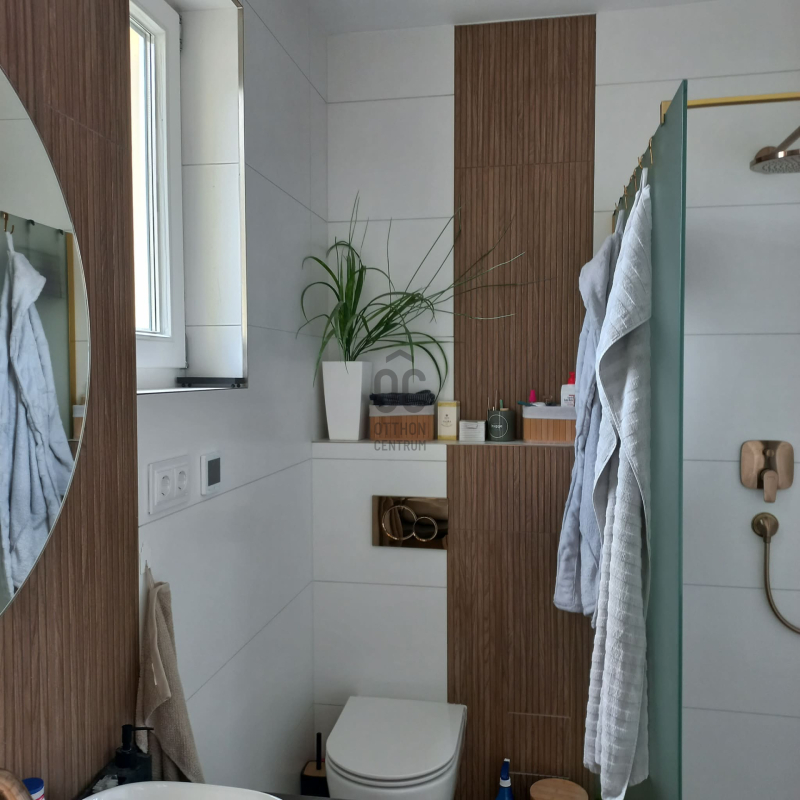 Az ingatlan egyedi kialakítással, az „A” és „B” épületrészeket összekötő nyaktagra történt ráépítéssel valósult meg a 2. emeleten. A korszerű, 44-es Porotherm Thermo Rapid téglából épült (A+++ energetikai besorolás), így fenntartási költsége rendkívül alacsony.