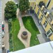 A lakás délkeleti irányba, konzolos túlnyúlással bővült, ennek köszönhetően alapterülete meghaladja az alatta lévő szintet.