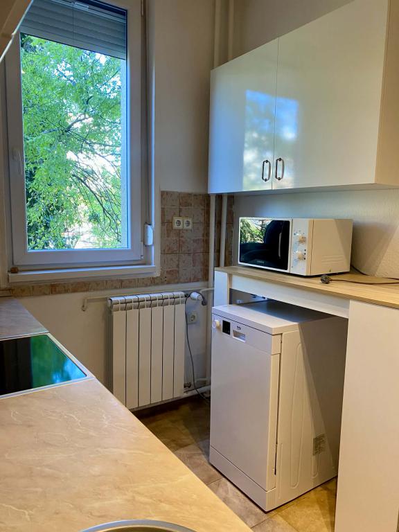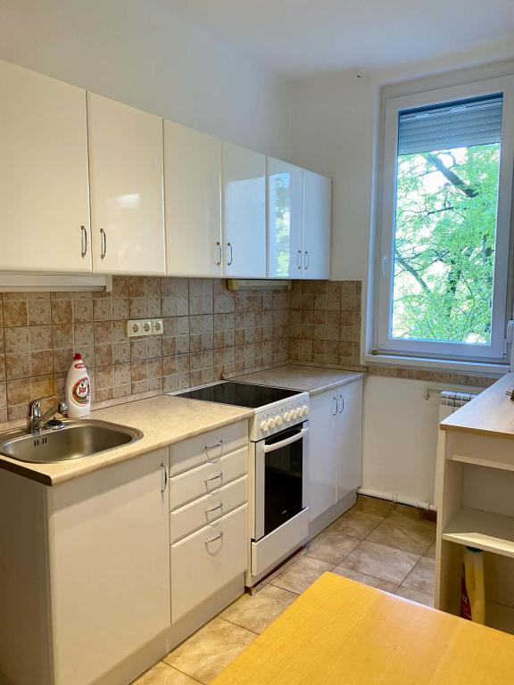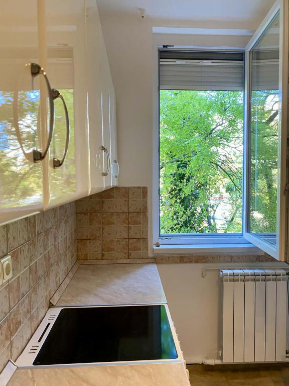 A lakás felújított, ragyogó napfényes (a konyha és a fürdő is), ráadásul csodás fák zöldítik minden irányból.