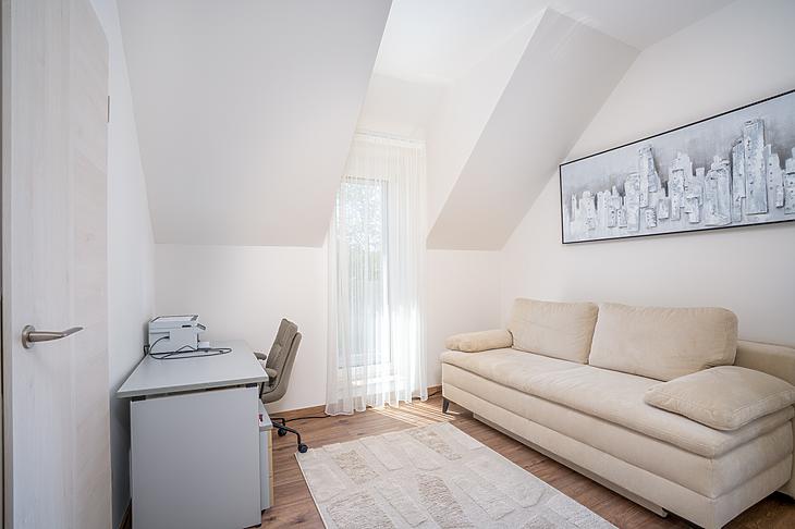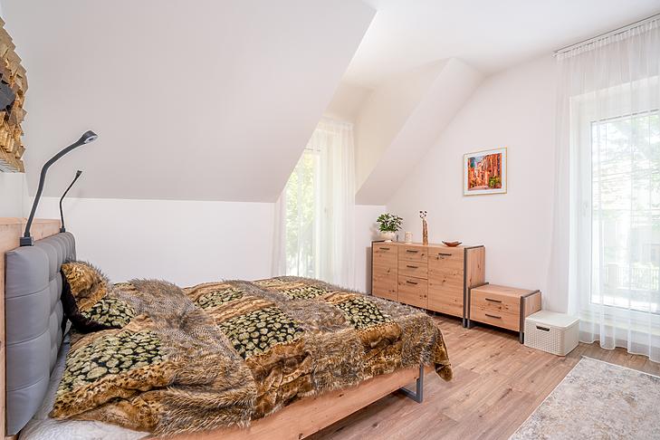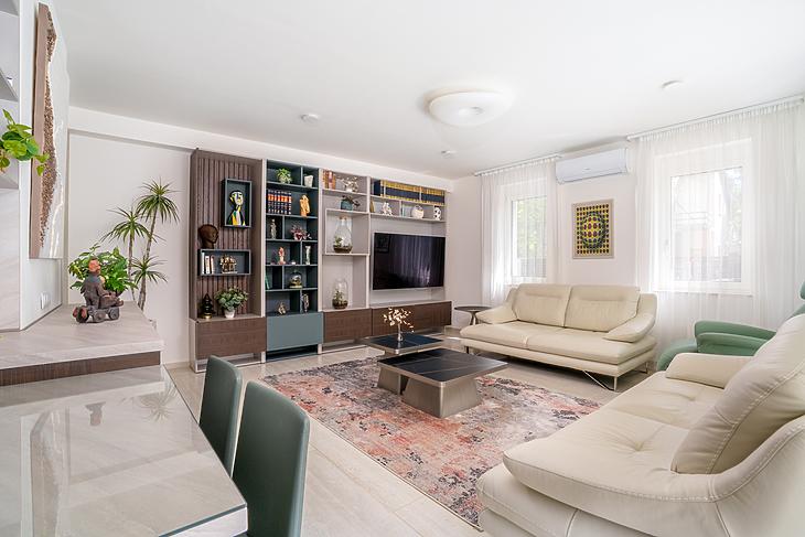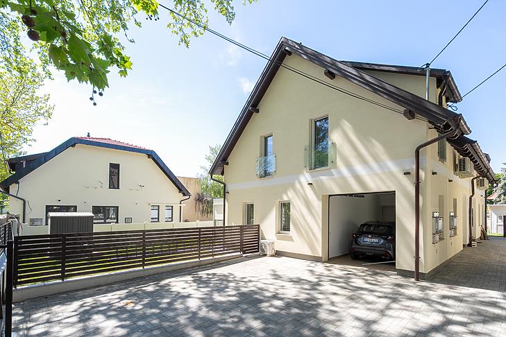 A 135 négyzetméteres, duplakomfortos ingatlan 2025-ben épült, 120 négyzetméteres kertkapcsolattal.