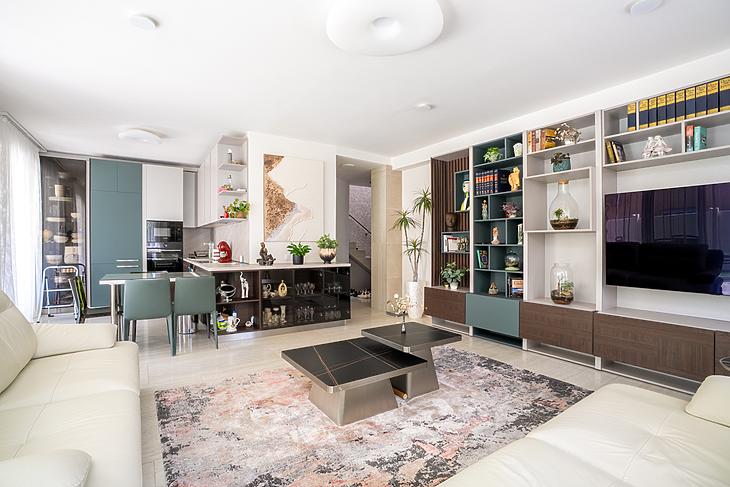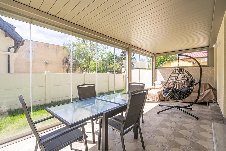 Elosztása amerikai konyhás nappaliból, 3 szobából, 2 fürdőből és egy fűtött garázsból áll. Tartozik még a házhoz egy 21 négyzetméteres terasz is, valamint egy Bioklimatikus Pergola-ból élvezhetjük a kert nyugalmát.