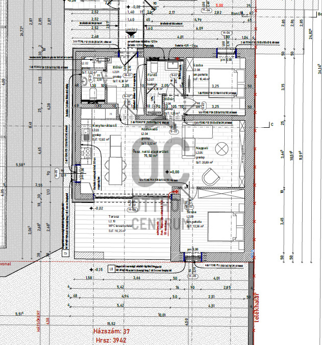 A bemutatott lakás a földszinten található (a tervrajzon LAKÁS2 jelöléssel), és 75,5 m² lakóterülettel rendelkezik.